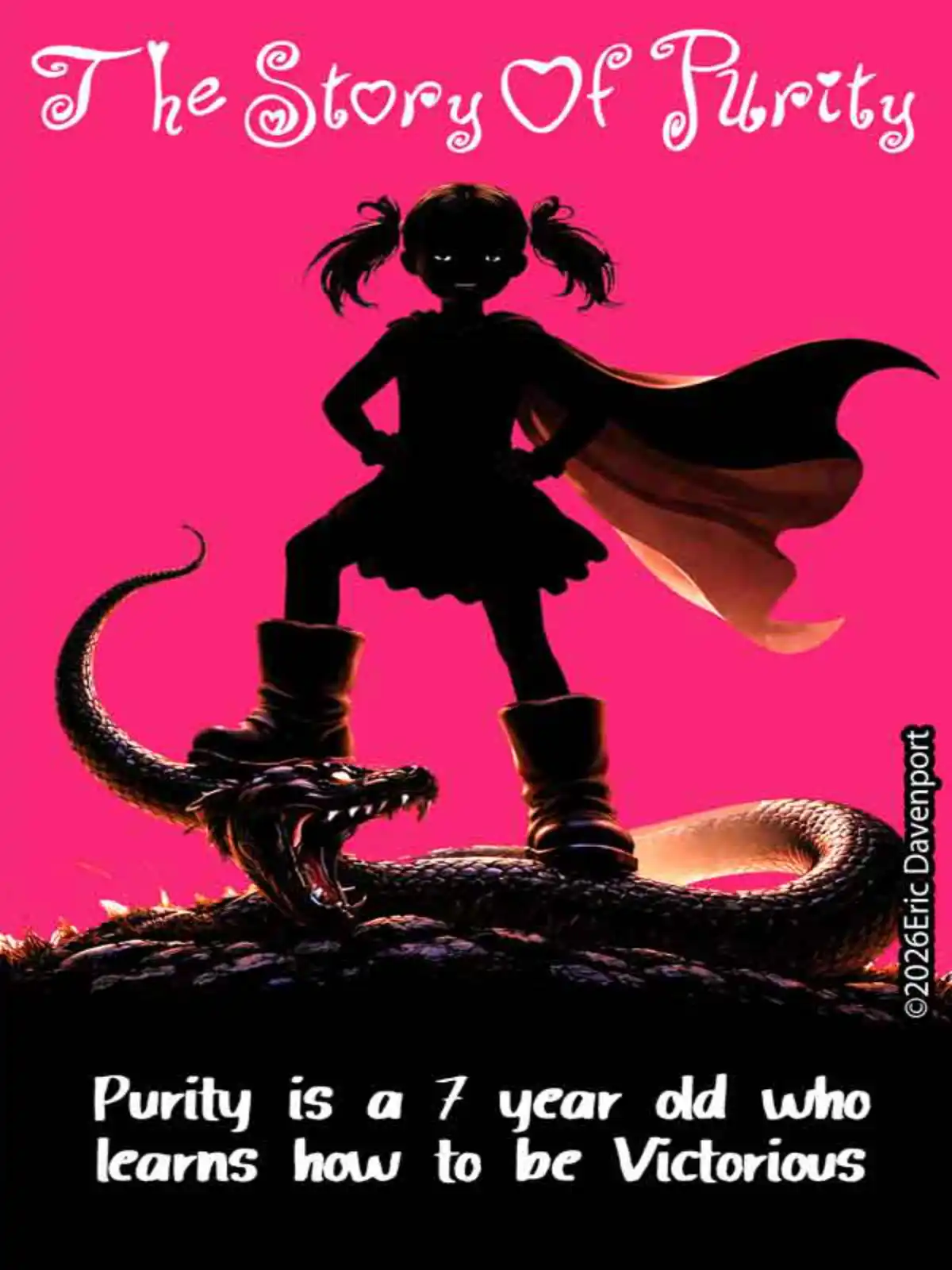 Purity is a 7-year-old girl who learns how to overcome obstacles in life and how to be victorious over the dark forces at work all around us. Purity learns how to step into her “Father’s Boots” which were made for treading on the dark serpent’s head. The Story of Purity is as symbolic as it is literal and highlights the power of God a humble little 7-year-old can have using the flaming “Sword of the Word” to defend herself and her developing character. As her name suggests, she is also pure in thoughts and actions, which is our “Clothing of Righteousness” or essentially what Ephesians 6:11 says: “Put on all of God’s armor so that you will be able to stand firm against all the strategies of the devil”.
